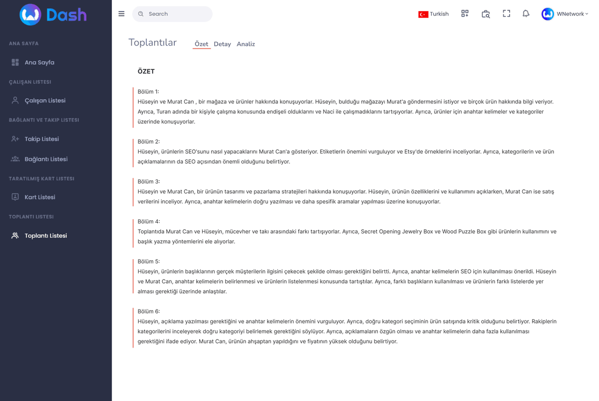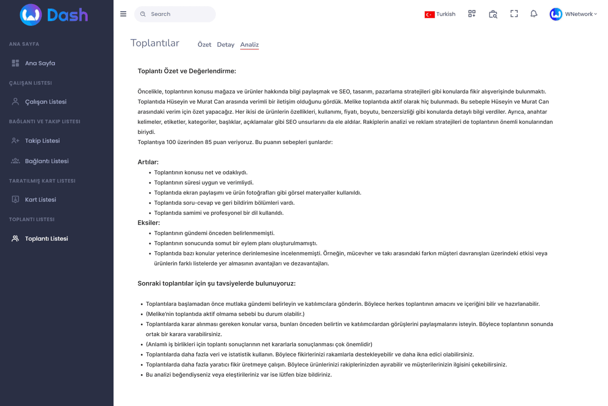 Find out what was discussed, what decisions were made and what actions were planned in a concise and concise way.With WNetwork, managers or company owners who cannot attend the meeting or who want to see the analysis of the meeting can easily read the summary of the meeting and follow what needs to be done after the meeting. Contact us to analyze your meetings with WNetwork.